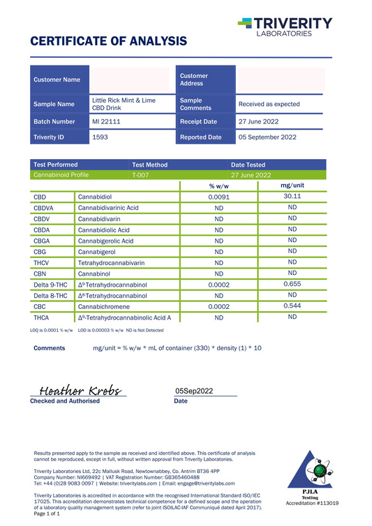 12 x Little Rick Drink 32mg CBD Sparkling 330ml Mint & Lime