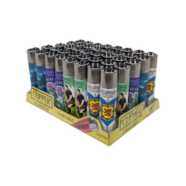 - Each pack contains 40 Clipper Large Refillable Lighters in 4 assorted designs.